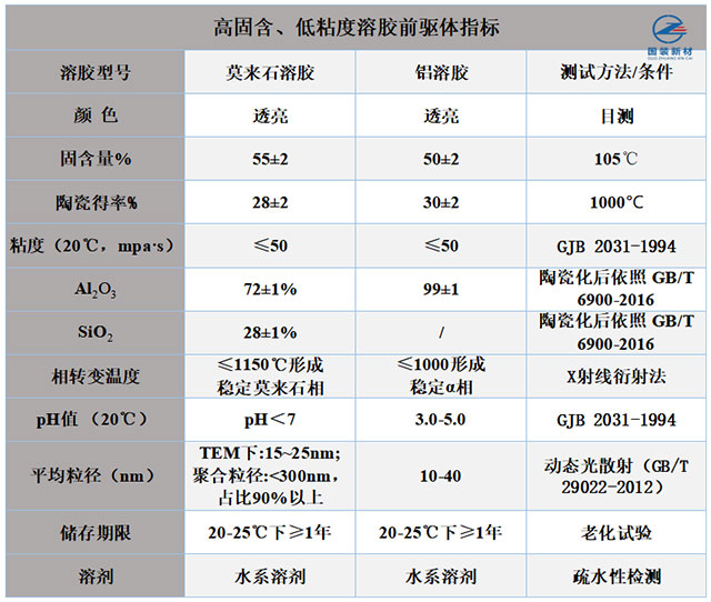 随着科技的迅猛发展,对材料耐高温、抗氧化、耐烧蚀的需求日益提高。氧化铝陶瓷前驱体有两个典型代表 —— 莫来石和α-Al₂O₃,以其高温稳定性好、低膨胀系数以及优异的力学性能而备受关注。为此国装新材科研团队通过先进的溶胶-凝胶工艺成功研发出高固含量(55wt%以上)、低粘度(<50mPa·s)的莫来石溶胶和高固含量(50wt%以上)、低粘度(<50mPa·s)的铝溶胶。这一技术突破,保持高固含量的同时降低了溶胶的粘度,为多种领域的应用带来了更多的可能。